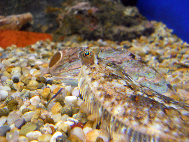 砂地の底の方にいるイメージだったホウボウさんは、大きな擬岩の上でパトロールするかのように旋回していて、胸鰭を拡げて正面を向いた姿がまるで航空機のようにも見えました。・°・。マガレイさんの綺麗なエメラルドグリーンをした眼が、時折上を見上げた時にキランと光るようすがかわいくて好きです。・°・。◎