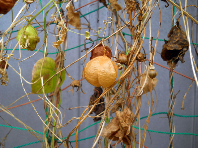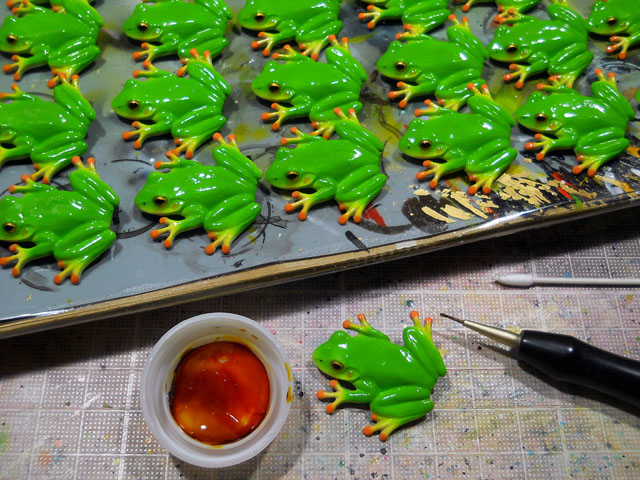 昨夜の雨はいったん朝方にはやみましたが、午後になって再び降りだしました。・°・。それでも気温は例年と比べて高めなので、過ごしやすくて助かります。・°・。軒先のグリーンカーテンは、今はもうすっかり茶色カーテンに変わり果てましたが、ルコウソウさんはまだがんばって真紅の花を咲かせております。・°・。* 朝顔さんもポツポツと日に1~2輪を開いておりますが、種の方はほとんどのものが熟し切っていて、フウセンカズラさんもまだ黄緑色の実がちらほら見られるものの、モナカ色からカラメル色になって風にゆれております。・°・。そろそろ種の収穫をしようかなと思っております。・°・。● ブローチ制作の方は程よい気温のおかげではかどりました。・°・。写真はオキナワアオガエルの鼓膜の色を筆塗りしているところです。眼のすぐ後ろにある鼓膜部分に、クリアーイエローをメイクのチークみたいに施してゆきます。・°・。(o^v^o)