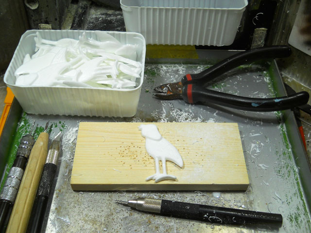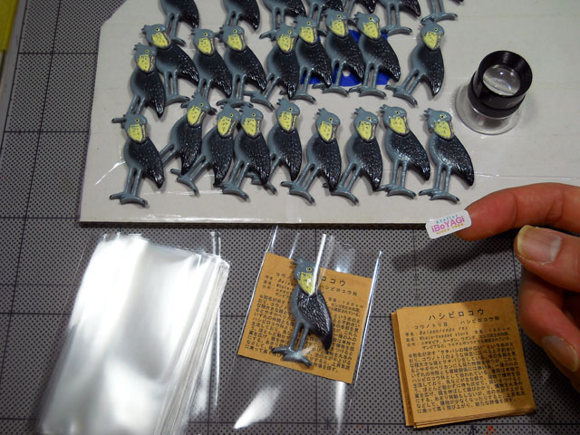 昨夜の雨は夜遅くなって雨脚が強くなり、アパートのトタン屋根に穴が空くのではないかと思う程激しい雨音が響いておりましたが、今朝には再び気持ちのよい青い空がのぞいて、まぶしい陽射しが降り注ぎました。・°・。二階の階段の踊り場にある小窓の前には、オリヅルランやゼブリナ、ハオルチアなどの観葉植物を置いているのですが、あたたかい小春日を受けてすくすくと茎を伸ばし、よく葉を茂らせて生長の著しいこの頃です。・°・。◎  連日制作に励んで参りましたブローチ作品ですが、オーダー分をパッケージィングして発送いたしました。写真は解説文を記したカードといっしょにOPP袋に入れたハシビロコウと、封止用の社名シールを写したものです。右上に写っているのは、最終確認用の倍率15倍のルーペです。一点一点仕上がりに問題がないかチェックしながら袋に収めて参ります。・°・。(@_@) この秋初めてのラ・フランスをゲットしたしました。今までいただいてきたのと比べて、だいぶ大玉の立派なサイズでしたが、ちょうど食べ頃に熟れていて大変おいしゅうございました(o^-^o)♪ アトリエ☆イボヤギ 木村大介