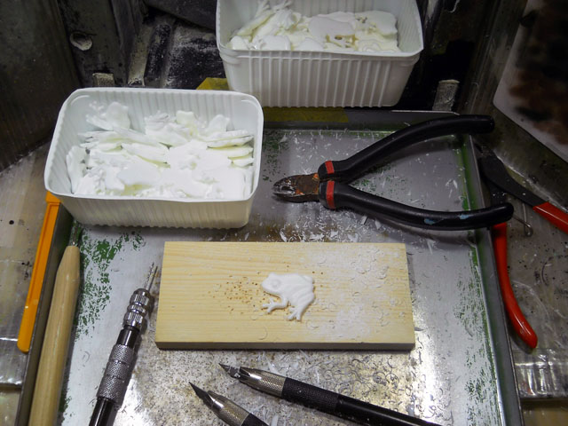 今朝は予報通りのよいお天気に恵まれて、ランドリーも気持よくすっきりと乾いて助かりました。・°・。◯ 最近、小カブが安いので葉ごと美味しくいただいております。カブの本体は葉といっしょに塩もみにして、残りの葉と茎は味噌汁に入れていただく事が多いです♪ 昨日の帯留め作品に続いて、ブローチ作品の新たなロットの制作にも着手いたしました。・°・。写真はモウドクフキヤガエルの大まかなバリを取っているところです。細かい指の間のバリは、細密ドリルのピンバイスで穴を開けてからニッパー等で取り除きます。・°・。◎ 今宵は西の空に高架電線をシルエットにして、夕焼けがきれいに見えました。・°・。*
