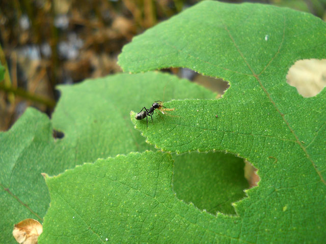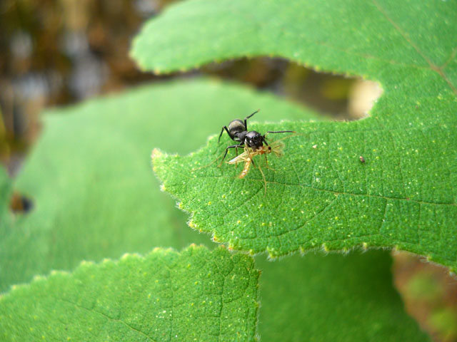秋も深まり気温が下がるに連れて、身近に虫たちを見かける機会も少なくなって参りました。。そこで今年撮り溜めて来たアーカイブの中から、少しずつご紹介させていただきたいと思います。・°・。今回は10月23日に不忍池の近くで見かけたアリグモさんです。すっかり葉がしおれて淋しくなった蓮の姿を眺めていると、足元の小木の葉の上に何かをくわえたアリの姿が目に入りました。。カメラを近づけると・・危険を感じたのか、せっかくゲットした獲物を葉の上に置いたまま、慌てて葉の裏側へ隠れてしまいました。。その動きを観ていてアリじゃなくてアリグモさんかな・・?と思っていたら、再び葉の表側へ姿を見せて、牙(大顎)が大きくないのでメスのアリグモさんだと判明いたしました。・°・。◯ 獲物はユスリカの仲間のようでしたが、その大事なごちそうをまたくわえ直して、さてこれからどうしようかと悩んでいるようにも見えました。・°・。もしかしたら獲物をくわえたまま葉の裏には回れないのかな・・?とも思ったのですが、なかなか行動に移せずに迷っている様子でした。。