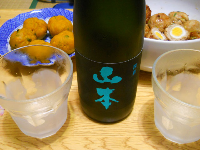 いっしょにお月見をする友人が買って来てくれた、お勧めの日本酒「深蒼・山本」をグラスと共によく冷やしておいて、出来上がったお月見料理といっしょにおいしくいただきました。・°・。(o^-^o)♪