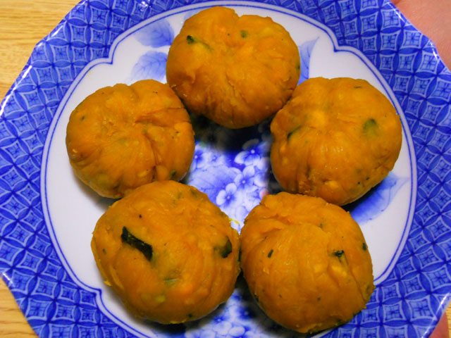 明日は十三夜のお月見の日ですが、明日の晩は予定があるので今夜を一足早い前倒しのお月見といたしました。・°・。宵の口に作り始めたお月見料理は、今夜のお月さまの形によく似たウズラのゆで卵を、鶏挽き肉で包んだものと、スウィートポテトのような食感のかぼちゃ巾着です。・°・。◯