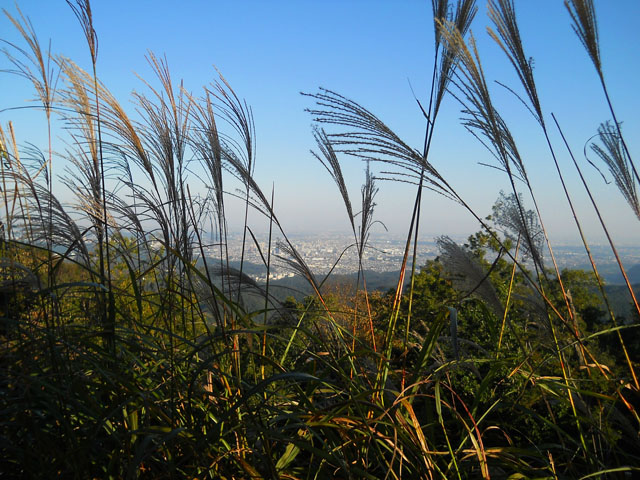 美しい草木や虫そして鳥の鳴き声に癒されながら、あまり疲れを感じることなく山頂へとたどり着くことが出来ました。・°・。雲一つない快晴の空が拡がって、遠く青みがかった山々の間から富士山の威容も認められました。・°・。ススキの間から遠くの町並みも眺めることが出来ました。・°・。帰りはコースを変えて吊り橋を渡る4号路を通って下山いたしました。・°・。適度にゆれる吊り橋はスリルもあって心地よかったです。・°・。♪