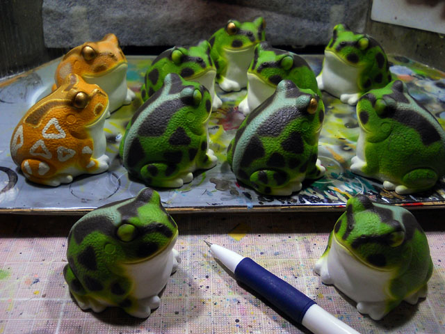 秋晴れの晴天が続くおかげで、洗濯物が気持ちよく乾いて助かっております。・°・。シーツやタオルケットなど寝具類をまとめて洗っても、夕方前にはカラッとしていて爽快です。・°・。永らく制作途上で中断していたチャコガエルの立体作品でしたが、完売により在庫がなくなった為、久し振りに塗装を再開いたしました。写真は斑紋柄をエアブラシで吹き付ける前に、その下書きをシャープペンシルで描き込んでるところです。・°・。市営グラウンドで見上げた宵の空は、澄み渡った青空に雲がとても高く見えました。・°・。*