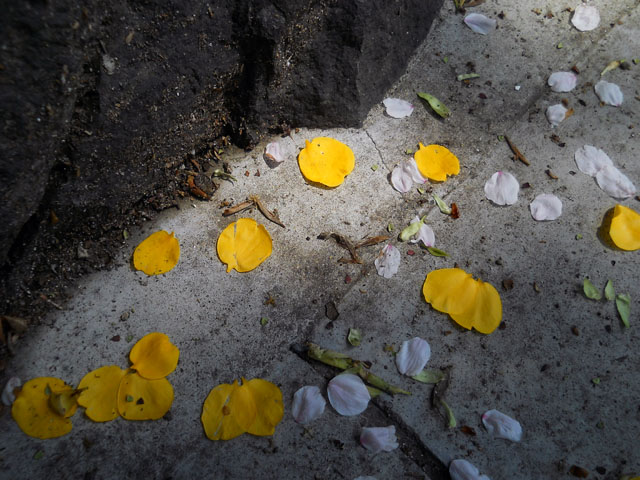 雨の予報が少しずれて、昼過ぎまでかなり暖かい日差しと空気に包まれました。・°・。上野公園では満開を過ぎた染井吉野以外の桜も、たくさん咲いていてにぎやかな雰囲気でした。・°・。最初の写真は真っ白い花が印象的な白妙(しろたえ)という品種です。歩道沿いに咲いていた濃いピンク色で、花弁が細かく裂けて花火のような花は、枝振りから梅の仲間かな?と思って調べてみましたが、結局名前は判りませんでした。・°・。* 歩道の上には山吹の黄色と、桜の花びらが明るいドット柄を描いておりました。・°・。◯❍
