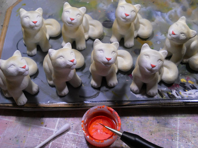 今朝アパートの裏庭のブラックベリーの見回りに行きますと。。昨夜の雨露に濡れた葉の上に、見慣れないカメムシの幼虫がおりました。・°・。調べてみますと、どうやらそれはツノアオカメムシさんの5齢幼虫のようでした。・°・。成虫になると綺麗な金緑色になって、肩の張り出したカッコイイ姿になるようで、大切なブラックベリーを吸われるのは困るものの。。成長した姿を見られる日が楽しみでもあります。・°・。ブローチの制作と平行して、ユキヒョウ・フィギュアの方も進行しております。写真・中央は艶消しのベースホワイトの上に、黄土色系を吹き付けているところです。この上にグレー系の色を施してから、鼻のサーモンピンク色を筆塗りいたします。・°・。アトリエ☆イボヤギ 木村大介