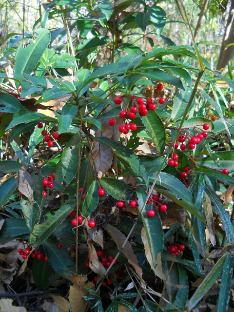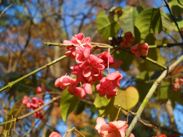 雲ひとつない真っ青な冬晴れだった本日は、最近よく足を運んでいる近所の雑木林を散策しました。よく晴れて陽射しは暖かかったものの、気温の方はだいぶ低く日陰では昼近くになってもまだ霜柱が残っておりました。・°・。林床に生えるマンリョウの実も、樹々の葉が落ちて明るさを増した森の中ではいっそう目立ち始めました。・°・。マユミの実はもう完全に熟し切って、赤い種子はほとんど落ちておりましたが、枝に残った果皮のサーモンピンクがとてもきれいに見えました。・°・。*