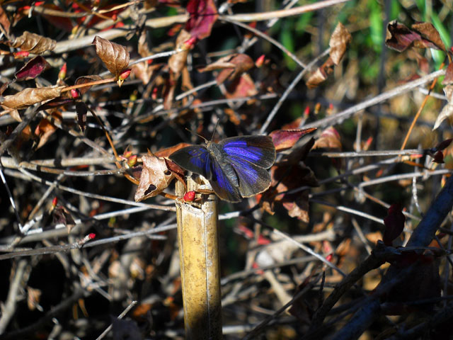 丘陵地の緩やかな坂を下ると、よく日の当たる場所で日本水仙の花が咲いておりました。お日さまに向かって凛として立つ姿が何かを主張しているようにも見えました。・°・。ベゴニアの仲間のシュウカイドウのピンクのつぼみも見かけました。・°・。市営プールの脇の枯れ葉の積もった生け垣の根元から、不意にヤマトシジミくらいのサイズの蝶が飛び立ちました。。いったんは遠くの針葉樹に留まりましたが、再び近くの生け 垣に舞い降りました。・°・。ゆっくりと羽根を拡げると、内側から深い紫色が現れました・・強い陽射しを浴びてキラキラと輝いて見えて、それはもう息を 呑むような美しさでした。・°・。(☆_☆) 後で確認してみたところ、予想通りムラサキシジミさんだと判りました。今年の秋の中頃に遠目に見かけたこと はございましたが、こんなにも間近でその姿を堪能したのは初めてで、大変感動いたしました。。成虫で越冬するそうで、こんな冬の時期でも気温が上がると活 動することも知りました。・°・。冬の日の散策の楽しみがまた一つ増えたステキな出会いでした。・°・。εïз