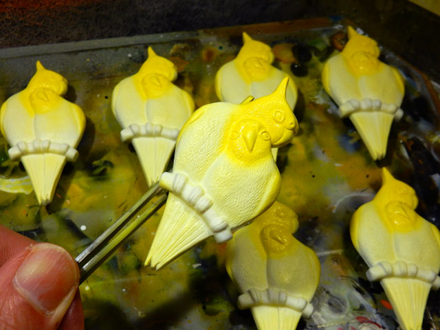 下地調整を終えた帯留め作品は塗装作業に入りました。・°・。写真は久し振りに再生産を行っているオカメインコとナナホシテントウです。オカメインコは今回はレモンイエローの体色が特徴のルチノータイプです。ペアの仲睦まじさをモチーフとした作品で、おかげさまでご好評をいただいております(⌒‐⌒) ナナホシテントウの方は、赤いリボンで包まれたマーガレットの花束の上に留まっている姿を象っております♪