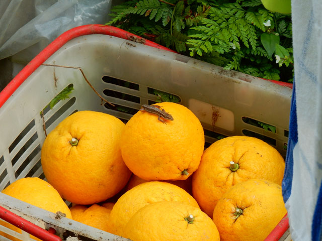 昨夜遅く、うちの近くで友人とオオミズアオ探しに出掛けました。と言いますのも・・・先週の金曜日の晩、ジョギングの最中に近くの公園の外灯の周りで飛び交う、数匹のオオミズアオを目撃したお話をしたのがきっかけでした。その夜は月が明るく照らす中、オオミズアオたちのパタパタという大きな羽音が聴こえて来るような、とても神秘的な光景でした。・°・。(*'-'*) 今夜は残念ながら空振りでしたが・・・帰り道には、東の空からまるで最接近間近の火星を思わせるような、みかん色の月が昇って来ました。・°・。先日収穫しておいた夏みかんですが、すべてを部屋に取り込むことが出来ないので、まだ半分以上は外に置いてあります。。ふと、縁側から外に目をやると・・・カナヘビさんが一匹、大きな夏みかんの上で日向ぼっこをしておりました(^^)