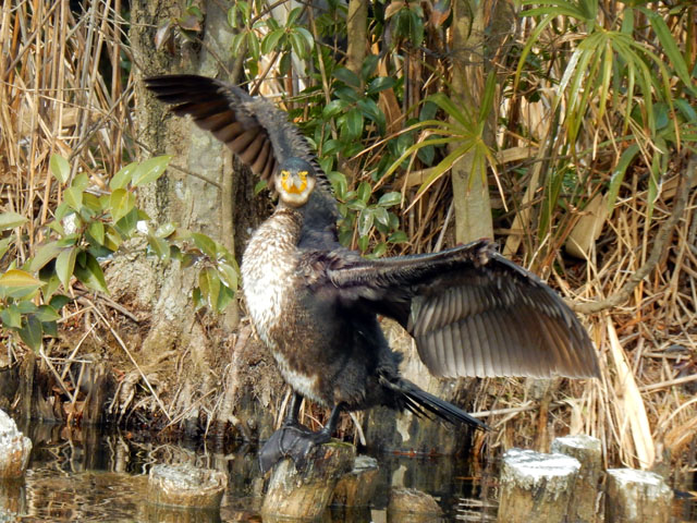 陽のよく当たる杭の上では、カワウさんが羽を拡げて乾かしながら、羽繕いをしておりました。望遠レンズでしばらく撮影していたら、レンズ越しに目が合いました(・・;) カワウさんのエメラルドグリーンの眼がとても美しくてすてきです。。。