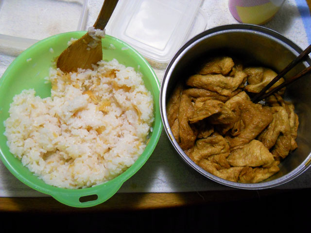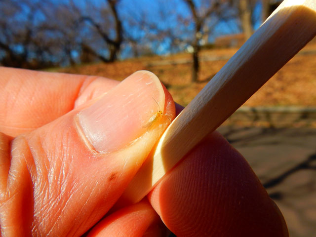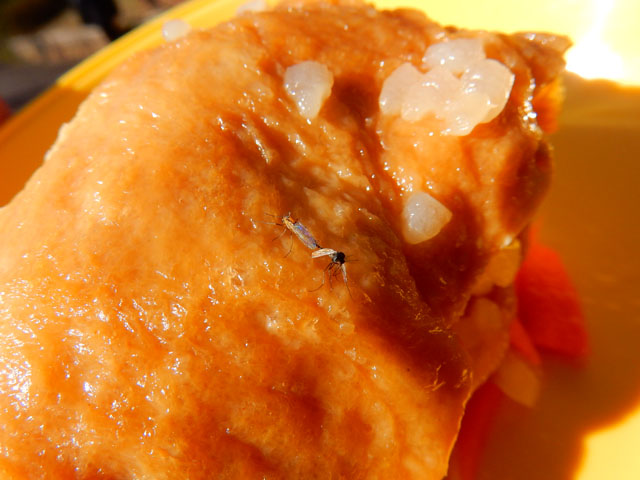 蝋梅園で目と鼻を楽しませていただいたあと、近くのベンチで友人と持ち寄ったピクニックランチにいたしました。・°・。手前が今朝こさえたお稲荷さんですが、慌てて詰めたので皮にご飯粒がまばらに付いております。。(-_-;) でもお味の方は美味しいと言っていただけました(*^_^*) 友人の方はニンジンと白菜の生姜漬けと、味付けゆで卵、白身魚とオニオンのフリッター、そして温かいお茶をいただきました。・°・。どれもいなり寿司との相性がとても良くて、たいへんおいしくいただきました(o^-^o)♪ ひだまりで食べていたからでしょうか? どこからともなく小さなユスリカのような虫がお稲荷さんに留まりました。。どうやら雌雄のペアのようで、よく見ると繋がっておりました。・°・。留まってみたものの、脚が貼り付いて動けなくなってしまったようだったので、割り箸の先で救出いたしました。しばらく脚に付いた甘い汁を拭っておりましたが、おそらく雌と思われる方は箸からわたくしの指の方へと移動いたしました。後で同定を試みましたが、この仲間の分類は大変に難しそうなので途中で諦めました。・°・。(^_^;) (その2へ続く・・・)