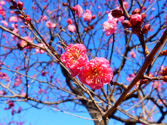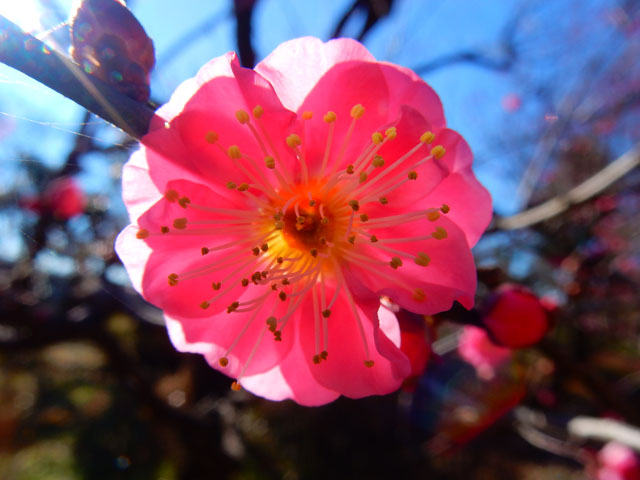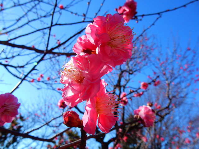 博物館を出て梅園の方へ歩いてゆくと、そよ風に乗って甘い梅の香りが漂ってきました。・°・。梅の方はまだ咲き始めでしたが、八重寒紅などの紅梅は結構さいていて、明るい陽射しと青い空を背景にして、とてもきれいに映えておりました。・°・。*