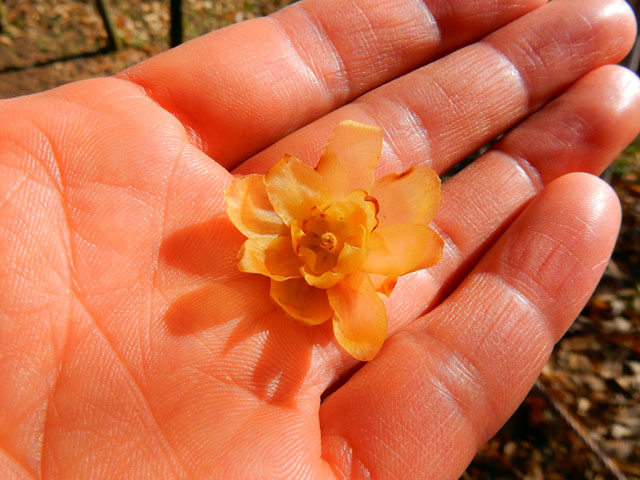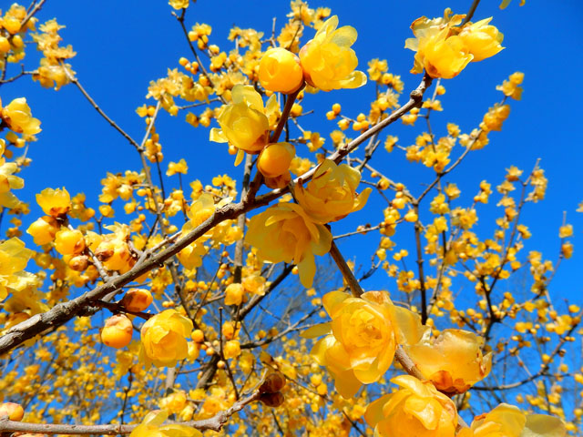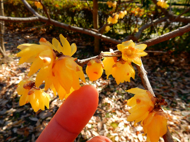 梅園を抜けて蝋梅(ロウバイ)園が見えてくると、梅よりもさらにハッキリとした優しげな甘い香りが感じられました。・°・。これまで蝋梅といえば、民家の軒先に植えられた一本の樹に咲いているのを見かけることはございましたが、たくさんの樹々がトンネルのように囲んだ小径を歩く機会は初めてで、その透けるような明るい黄色の花と柔らかいけど強い芳香に包まれて、とても穏やかで豊かな気持ちになりました。・°・。* 品種による違いなのか、花びらの先が尖ったものや、丸みを帯びたもの、色の濃淡なども微妙に異なっておりましたが、咲き始めのまだつぼみの開きかけたものほど香りもハッキリと感じられるようでした。・°・。早めに咲いた花のいくつかは地面に落ちていましたが、そっと手の平に乗せると冬の暖かい日差しを透かした薄い影が映りました。・°・。◎