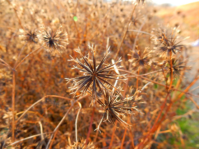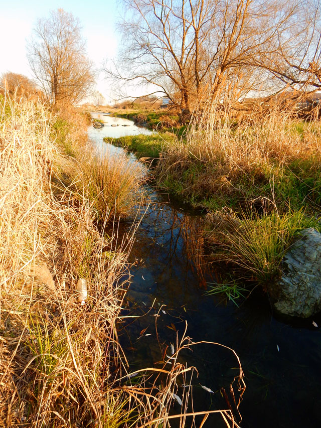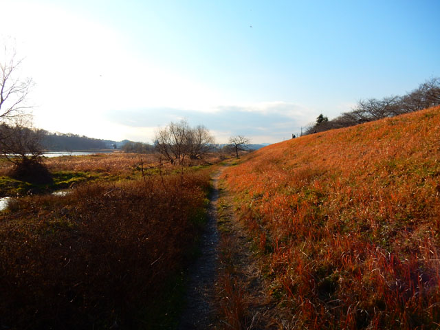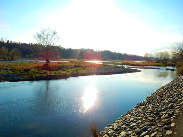 郷土の森を出て、近くを流れる多摩川の河川敷へと向かいました。・°・。土手の斜面にはきれいに染まった草紅葉が広がり、ひっつき虫のひとつでもあるコセンダングサの種が、河原にやって来るモノたちにひっつかんと、トゲトゲを斜面いっぱいに拡げて待ち構えておりました。・°・。(>_<); 辺り一面に生える ひっつき虫のトラップをかわしつつ、川面の見える場所まで出ると。。冬の陽射しを受けた水面が、まぶしく輝きながらゆったりと流れておりました。・°・。