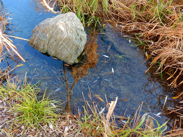 そんな穏やかな川面をオオバンの群れが通過したり、河原の樹々の枝先ではエナガの群れも観察出来ました。・°・。本流から少し離れたよどみには、メダカと思われる小魚たちの姿も見られました。・°・。<◎)) ><