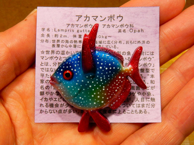 こう寒くなりますとさすがに虫ネタには事欠くようになって参りましたので、昨年撮りためた中から一枚を掲載したいと思います・・写真は昨年の11月末に上野の不忍池沿いの柳の葉に留まっていた、赤い目をしたハエの仲間です。黒っぽい身体にワインレッドの大きな複眼、飴色の羽など結構な手掛かりになると思い検索してみたのですが・・これかな?と思われる種類がなかなかヒットしませんでした・・双翅目の仲間は同定が難しいと言われますが、どの種類に近いのかも分からなかったのは、なんとももどかしい限りです・・(*´-`) 柳の葉の周りには数匹の同じハエが飛び交っておりました。・°・。*今日ご紹介する拙作品アーカイブは、アカマンボウの帯留め作品です。わたくし的には結構な自信作で、きっとご好評いただけると期待してリリースしたのですが。。。水族館でもアイドル的人気者で、知名度の高いマンボウとは異なり、実在の魚とは認識されていなかったみたいで、店頭でもあまり注目されないままラインナップから外れてしまいました・・(-_-;) 色が派手過ぎて着物に合わせにくいのでは?とのお店のスタッフ様からご意見を頂戴いたしましたが、作家の好みと現実の受けとのギャップを実感したよい機会となりました。・°・。(*_*)ゞ アトリエ☆イボヤギ 木村大介