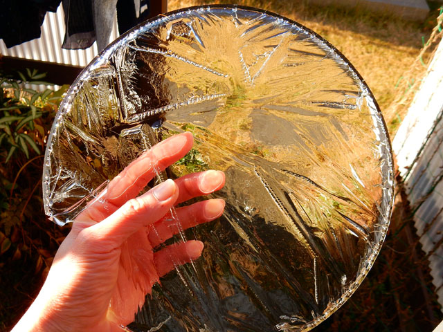 今朝の冷え込みは半端無く厳しく感じました。。とは言っても例年ですと縁台に置いた汲み置き水がもっと早い時期に結氷をするのですが、今冬はようやく初氷を確認いたしました。・°・。予報では今朝の最低気温がマイナス2度とのことでしたので、初氷にしてはなかなかの厚さで、大きな夏みかんを載せても割れませんでした・・手で持ち上げてみると、結構な重さを感じる、立派な氷でございました。・°・。◎ どうりで寒かったわけです・・(・・;)